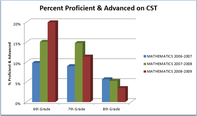 After implementing the model for one year, the CST data showed significant growth in mathematics. In the percentage of students scoring proficient or advanced in math, 6th grade increased 13%, 7th grade increased 12%, and Algebra increased 8%, for a net gain of 33%. That same year, English had a net gain of 1%, Science gained 4%, and History had no change.