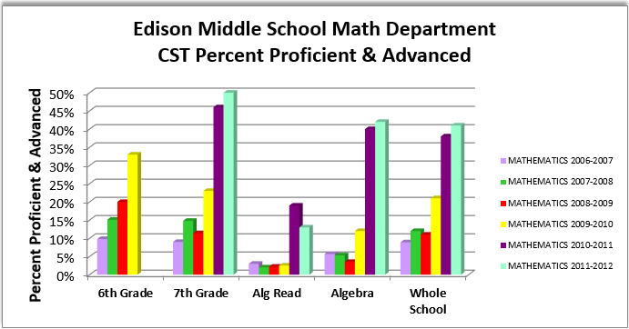 Students who come into EMS having 6th grade in elementary school have math scores that are (on average) about 8-10% lower than 6th graders in middle school. The 7th graders of 2011-2012 overcame that, and 50% of them scored proficient or advanced on the CST. In 2011-2012, EMS made their 8th grade Algebra program stronger by having 70% of 8th grade general ed students in Algebra, and only 30% in Algebra Readiness (a curriculum for students who are not deemed ready for Algebra). Typically, when more students are put into Algebra, scores drop, but EMS still managed to gain another 2%. Algebra Readiness students did have a drop in scores that year, but that is attributed to making sure only the students who are greatly struggling with math take that course, and having any students jump multiple band levels in one year is astounding.